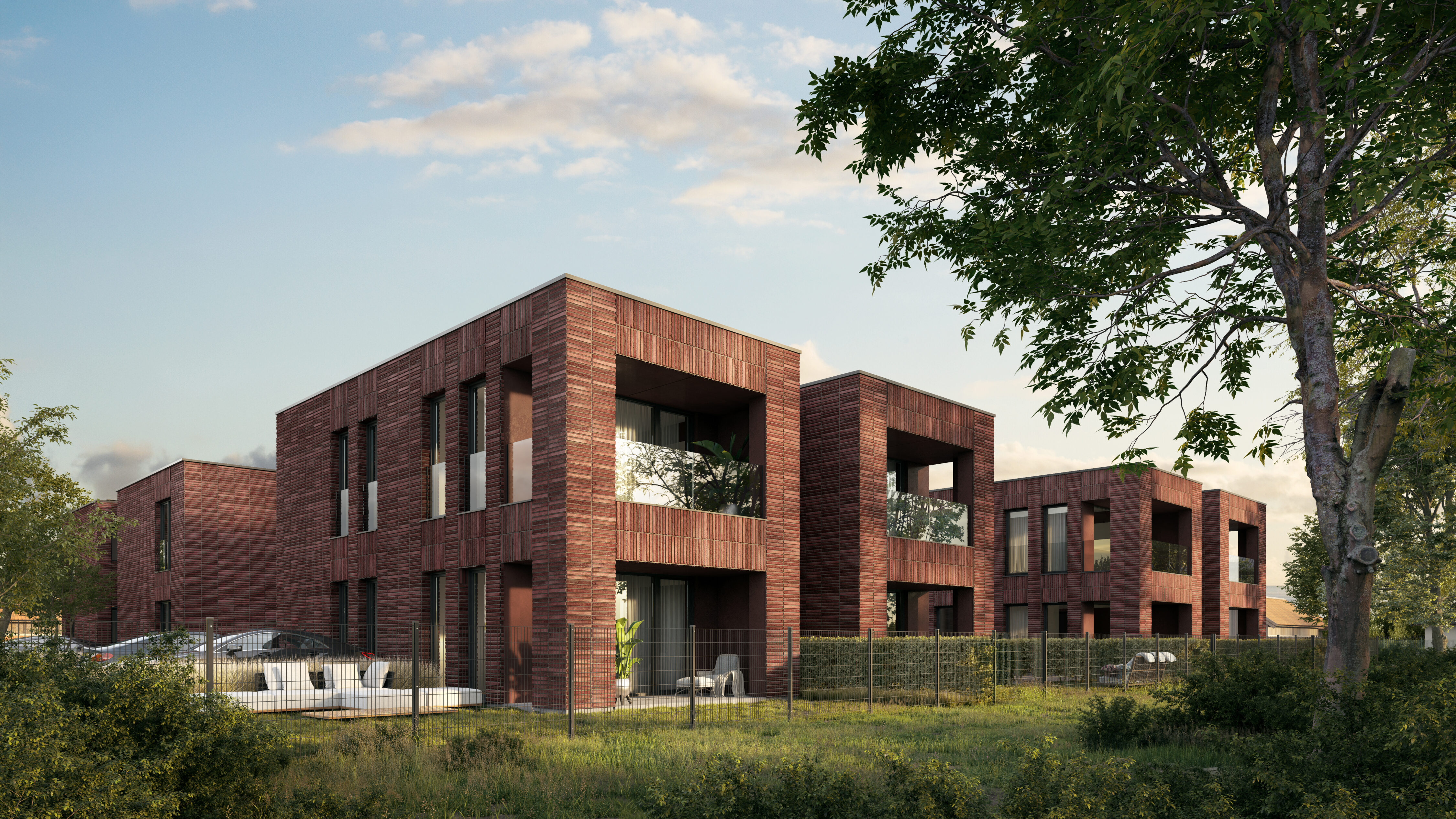 This visualization presents a modern residential complex of two blocks near a new transportation hub in Olsztyn, offering convenient connections. The buildings feature a simple design, enhanced by elegant clinker tiles and structural plaster. A carefully chosen color scheme contrasts dark gray with warm beige tones, giving the complex a modern look. Spacious balconies provide residents with comfort and a perfect space for relaxation.