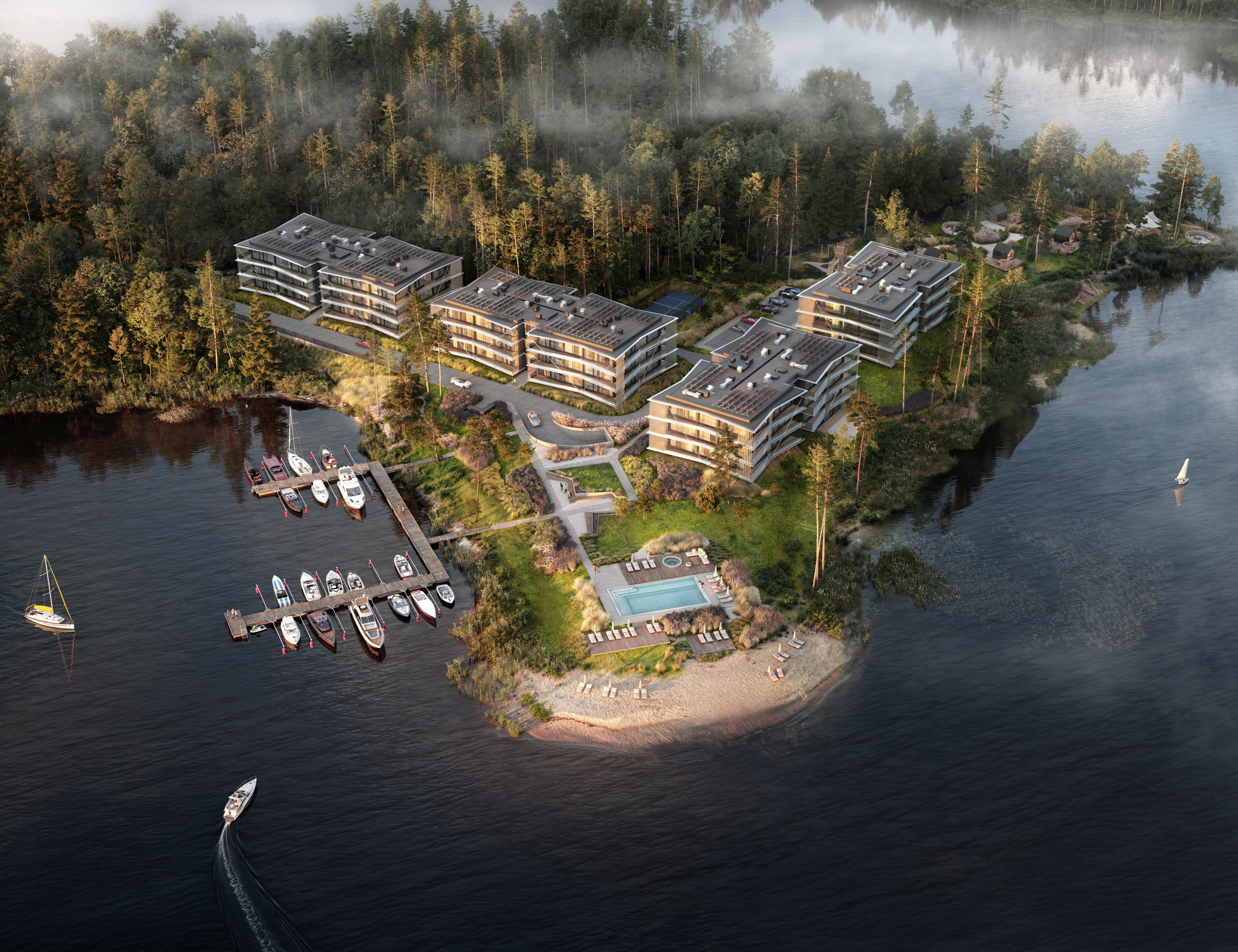 We present a visualization of a project located by the picturesque Lake Ukiel in Olsztyn, featuring modern buildings inspired by the design of boats and sails. The complex showcases predominantly white tones in both matte and glossy finishes, enhanced by chrome details that add an elegant shine. With the use of glass panels, residents can enjoy uninterrupted views of the lake and its natural surroundings. Every element of this space contributes to an atmosphere of peace and elegance, harmonizing modern style with the beauty of the lakeside environment.